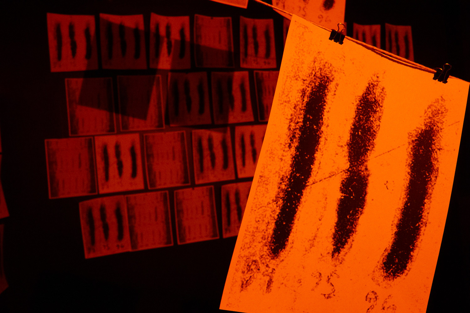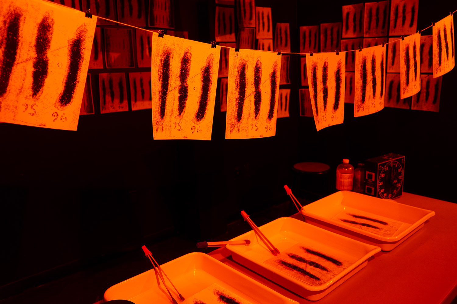 From the project proposal: "In a metaphorical attempt to record one’s self, I propose assembling a photographic darkroom scenario where every print and negative within is replaced with one image of 8 marks (two rows of four and four). This would be arranged in a similar manner as the darkroom in Michelangelo Antonioni's 1965 film, Blow Up. The main character, played by David Hemmings, lives a debauched but meaningless life as a professional photographer, but is left empty and searching for meaning. His only time of true purpose is while he is working in his darkroom. When David accidentally photographs a murder, the film converts to the protagonist finding answers of a different kind, which also provides his life with another purpose (survival). I would hope the viewer, who might not recognize this reference, would be impressed with a feeling of unease and sense of the uncanny, where every single image found in the space would be of exactly the same, banal and generic configuration."