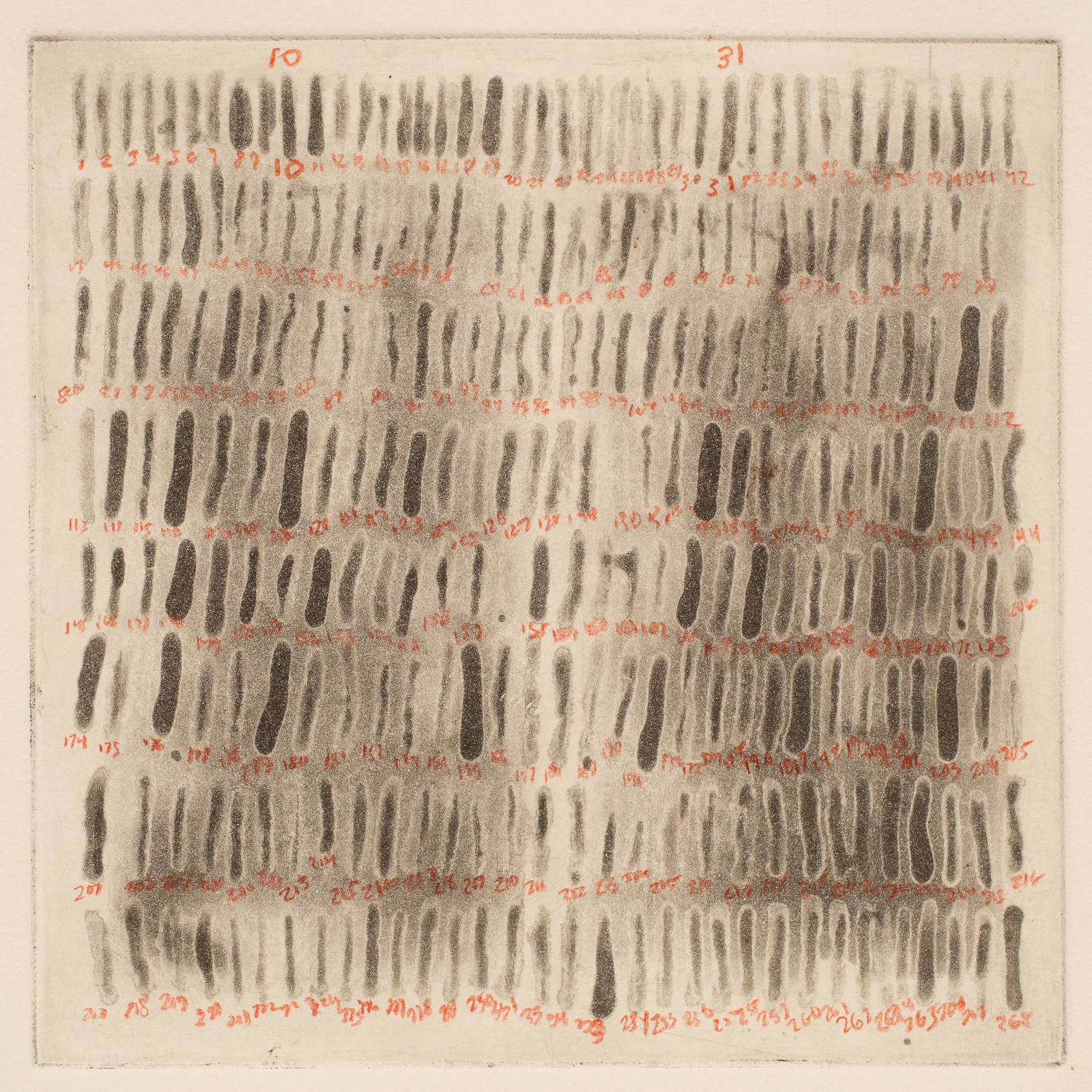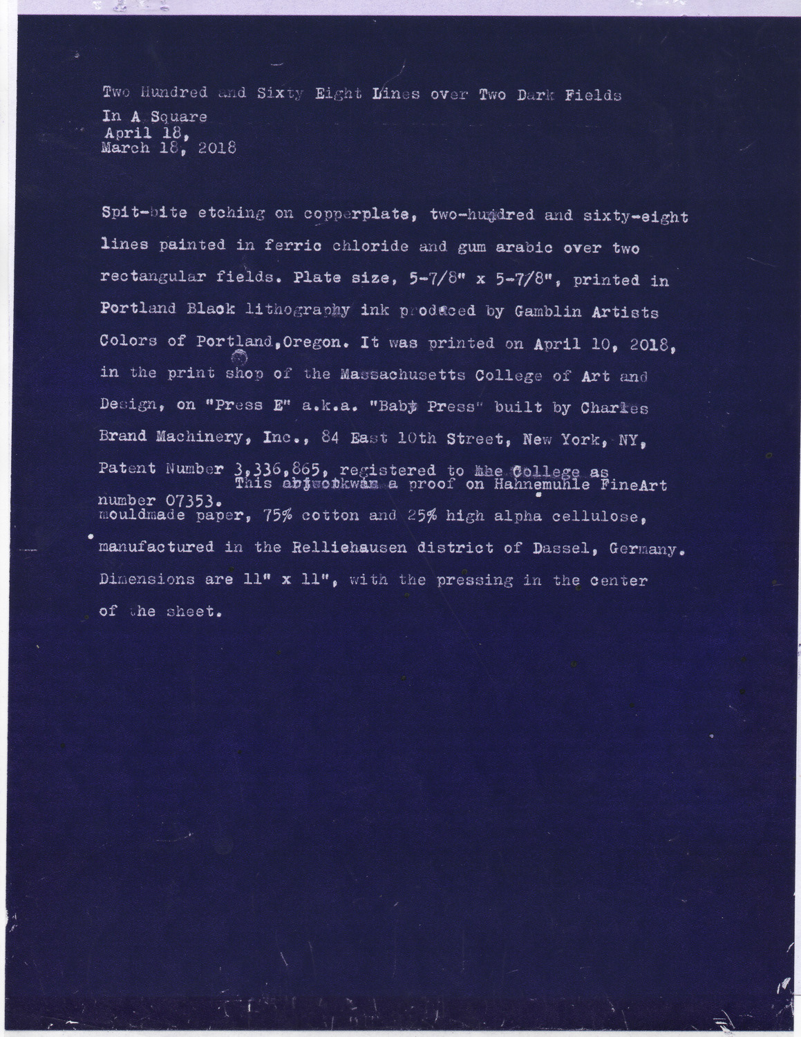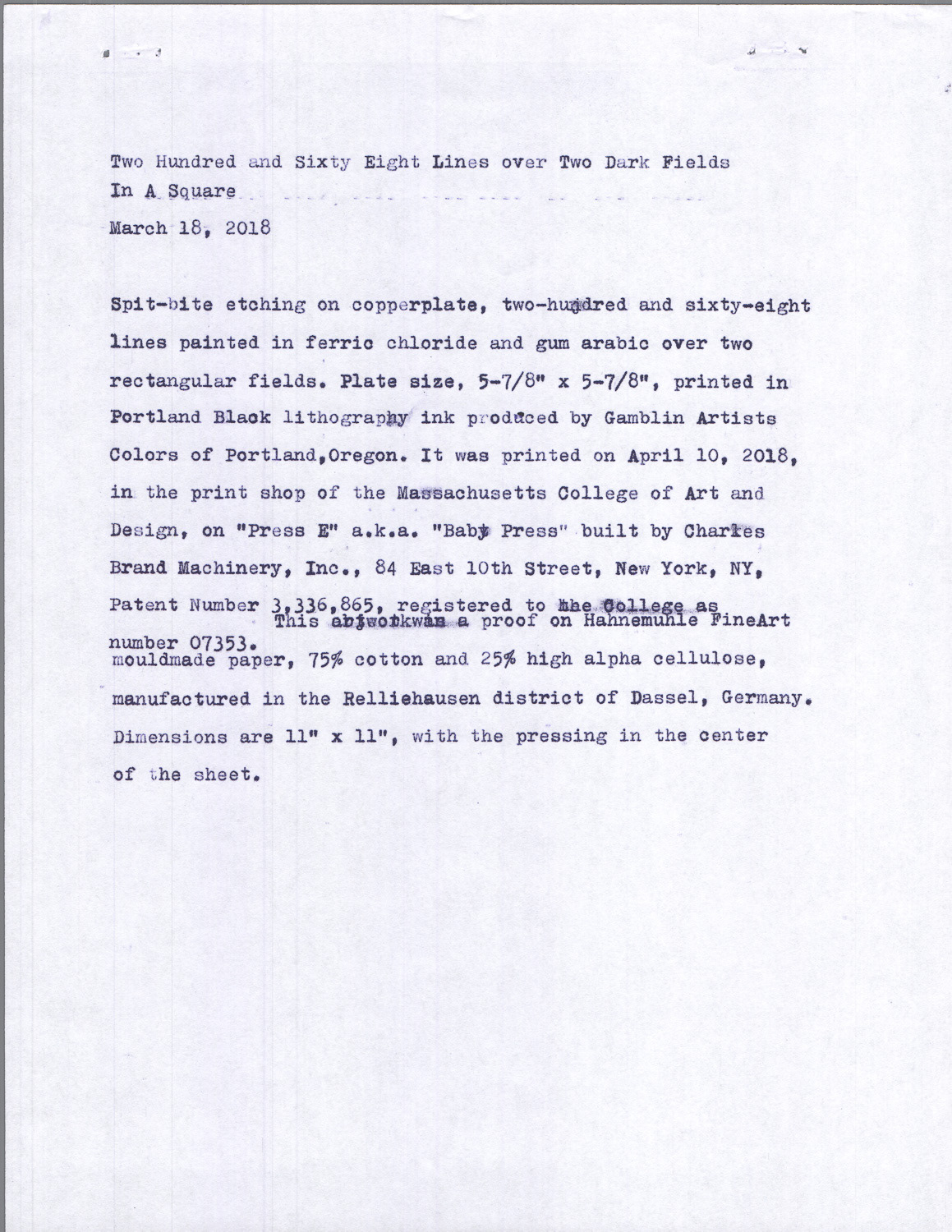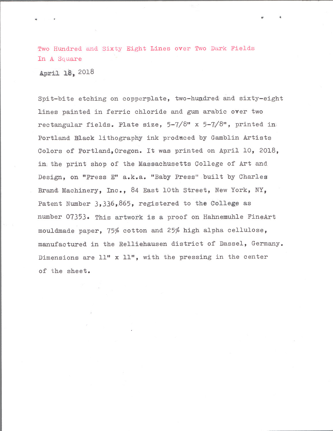 Copperplate spitbite etching with red pencil on Hahnemühle paper, typed documentation, carbon paper, paper, (unique, no edition). 5-7/8” x 5-7/8” (plate)